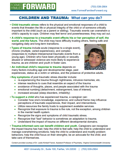 In today’s world, whether it is due to natural disasters, global conflicts, sudden acts of violence, or bullying in school, childhood trauma is a serious and valid concern. This 1-page fact sheet by Formed Families Forward, the CPRC serving foster, kinship, and adoptive families of children and youth with disabilities and other special needs in Northern Virginia, provides information to understand the types of trauma, potential responses to the trauma, and ways to support a child who has experienced trauma.