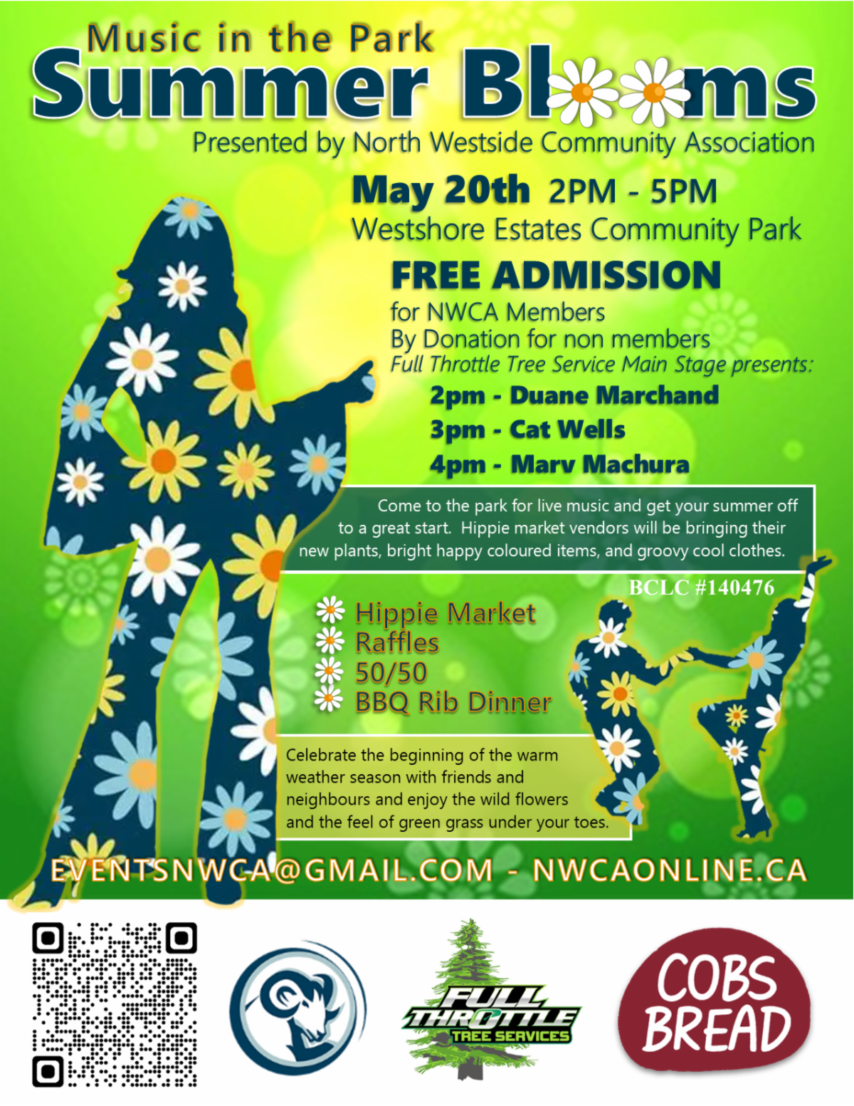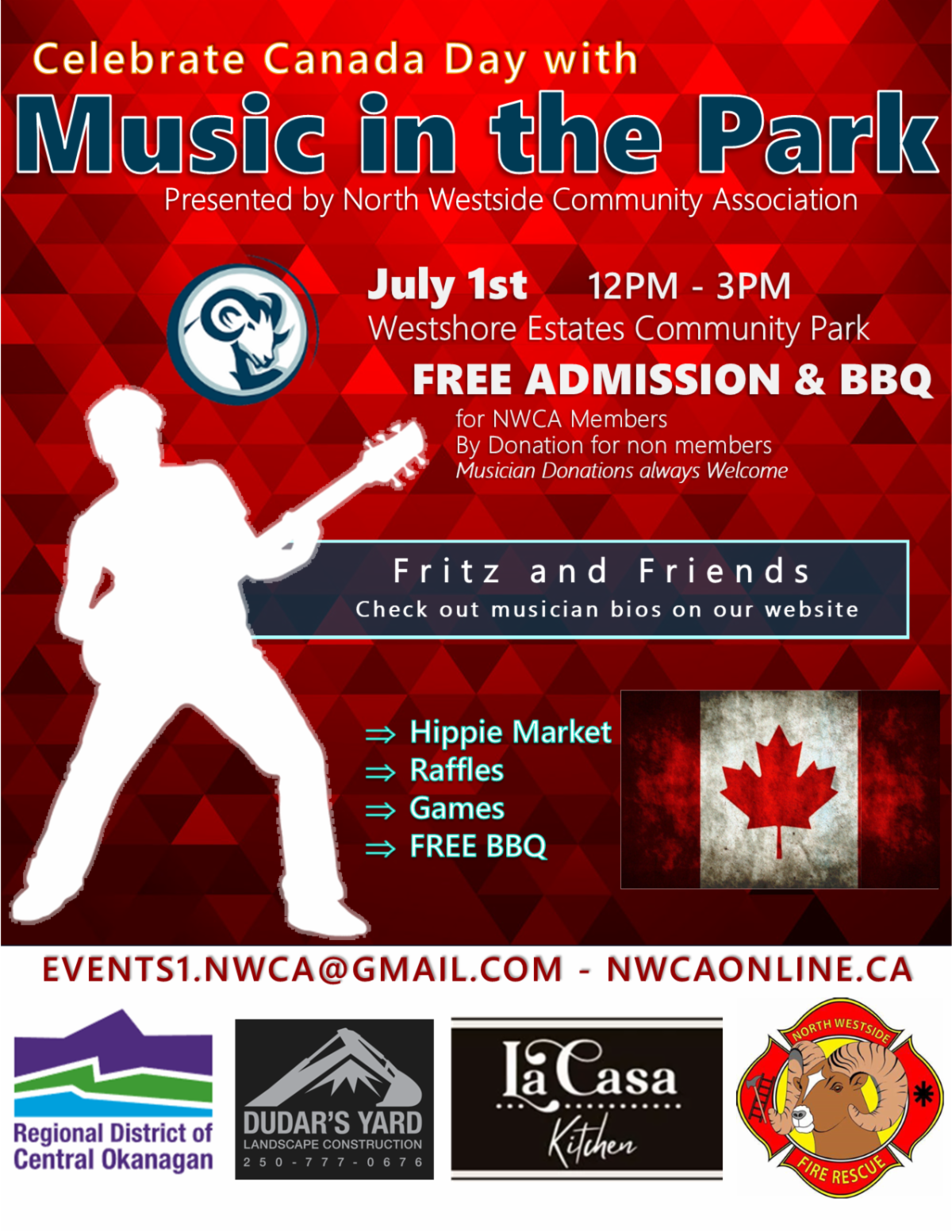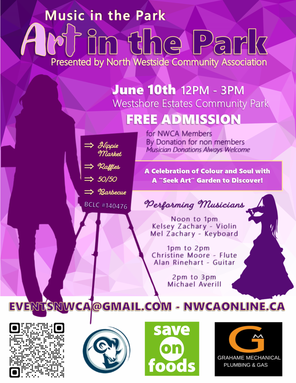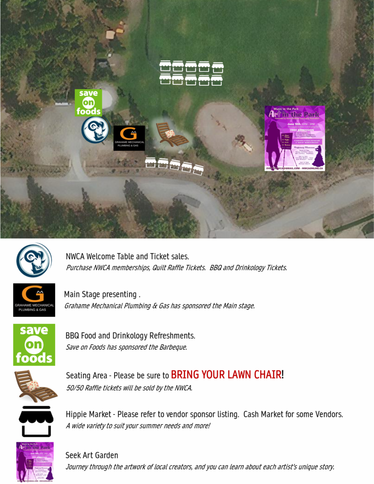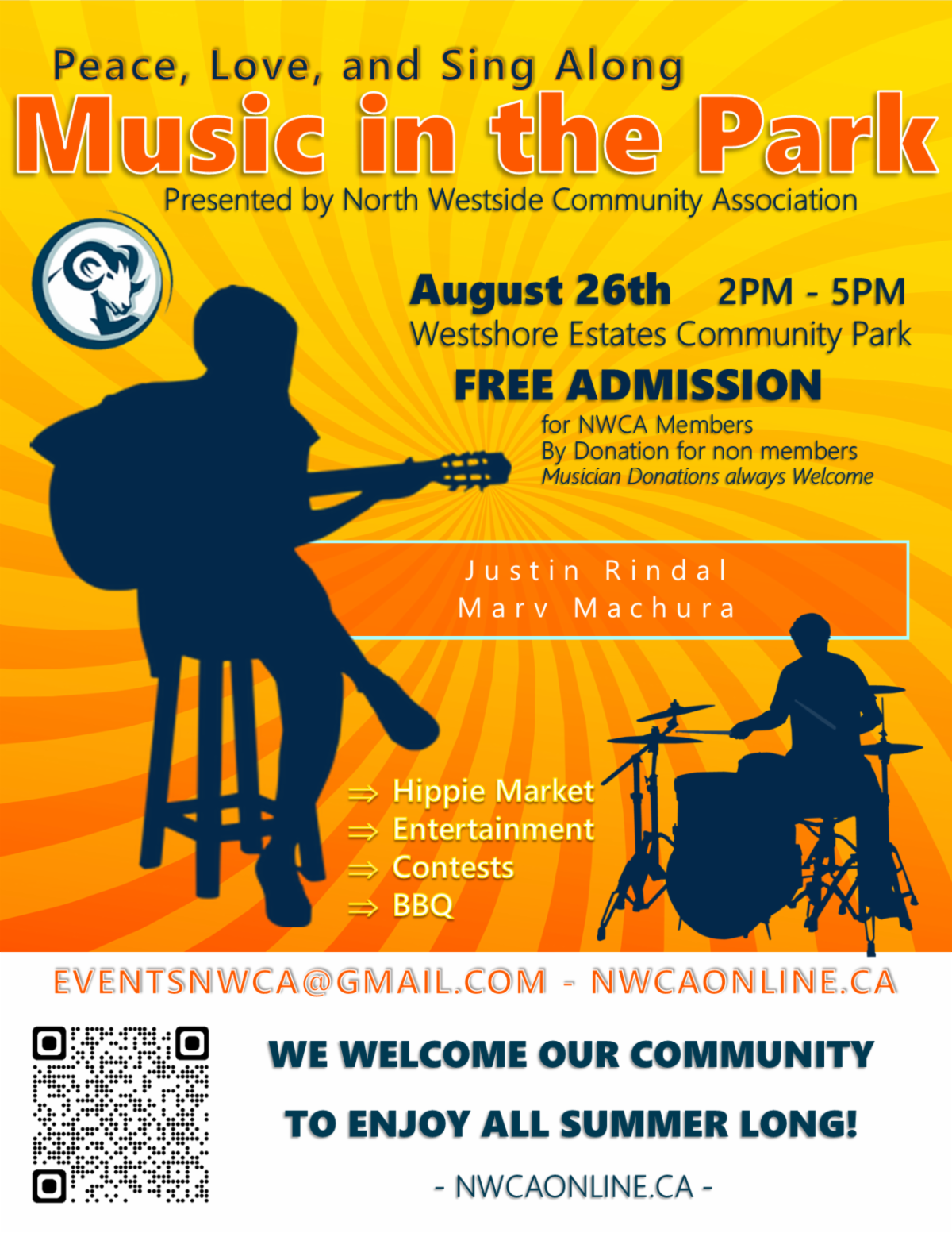 On a personal note, a big thank you to our NWCA Board who are so supportive of live music. Behind the scenes, Jaimie Dewar has worked tirelessly to create the posters and signage package to make sure that the event is well publicized. Hours of hard work from Jaimie, makes the events that much more appealing to everyone. Fawn Myndzak and Jason McColl set up the event and took her down, which is so much appreciated...'many hands make light work' my grandma used to say and it is so true. Paige Taylor who helped guide Hippie Market vendors to their spots and walked with the 50/50 bucket, helping make live music more feasible. Scott Graham and Josh Galloway who worked the front entrance and greeted everyone , thank you for your time and efforts. Andrea Kveton, who always shows up and knows exactly where she is needed and helped out at the barbecue and keeping everything moving and functioning smoothly, thank you Andrea. What a great team effort. | |
