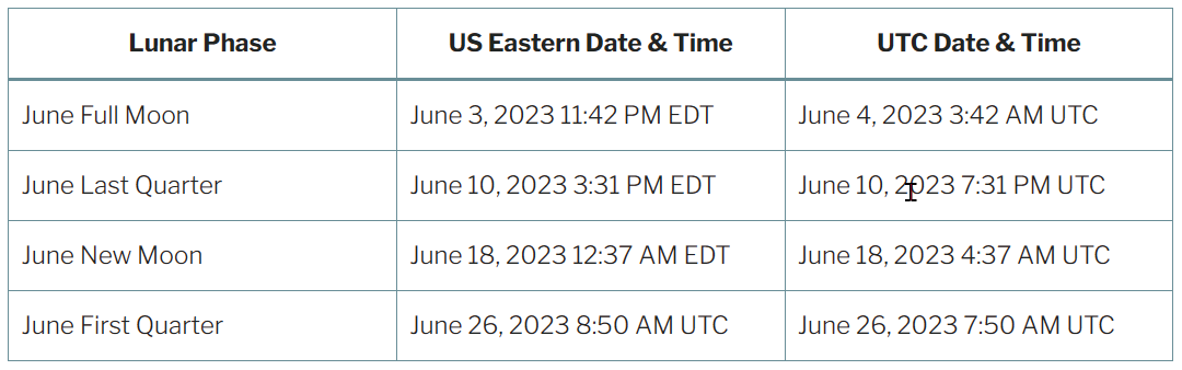 Below are the lunar phases for June 2023 including the new moon, first quarter, full moon, and last quarter that are on the schedule for each month.