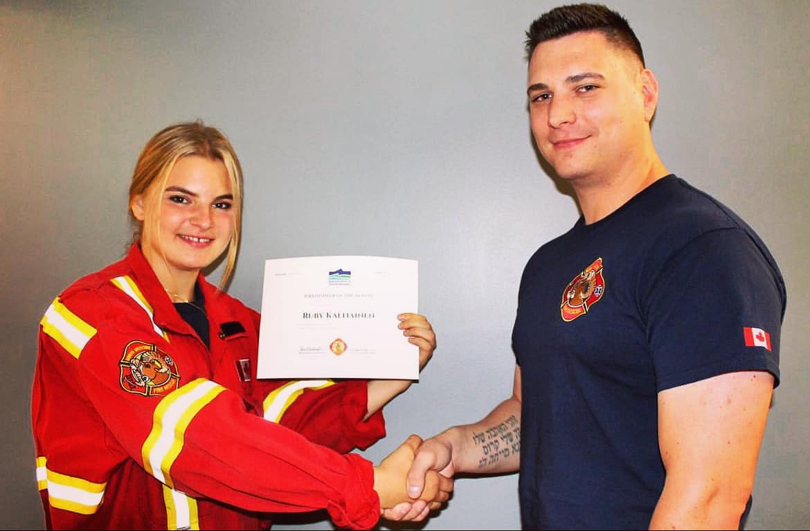 North Westside Fire Rescue is proud of our Junior Firefighter Ruby Kaltiainen. Not only did Ruby graduate from the Vernon Youth Police Academy this last weekend she was also a major award winner. Out of 33 students she was one of 4 to be awarded for her efforts. Ruby won the esprit de corps award presented by Vernon RCMP Supt. Shawna Baher. Congratulations Ruby!