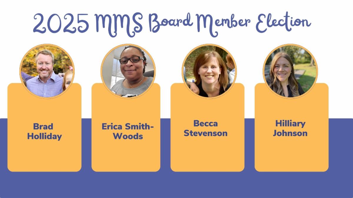 Congratulations to Brad Holliday, Erica Smith-Woods (Vice President) and Becca Stevenson (Secretary), who were elected to another term on the MMS Board of Directors, and welcome to new member Hilliary Johnson!