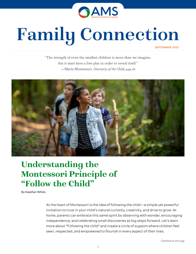 The AMS Family Connection includes articles on topics such as Montessori philosophy, Montessori tips for the home, a peek inside the classroom, and more.