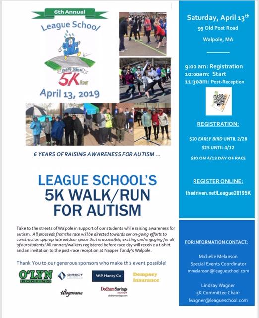 Join other businesses in the community and sign your company up to be part of a “Corporate Team Sponsor” for League School’s 6th Annual 5K Walk/Run for Autism being held on April 13th.