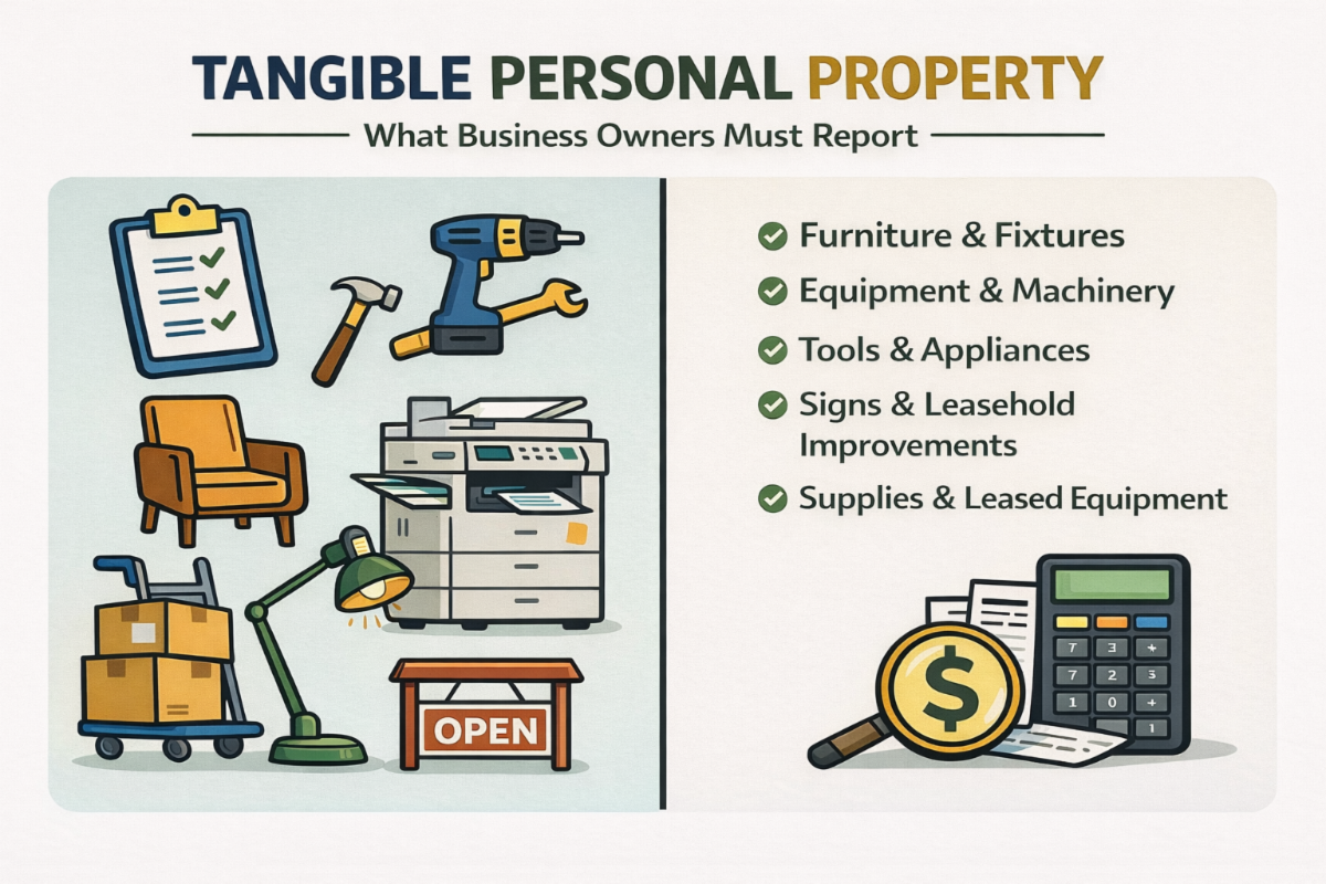Tangible Personal Property is equipment used in a business and includes furniture, fixtures, machinery, tools, appliances, signs, leasehold improvements, supplies, leased equipment, and other assets. It is taxed at the same rate as real property.
