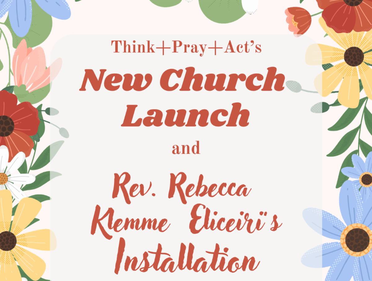 Also, we joyfully invite you to our Saturday, April 11 gathering at 12:30 to celebrate our launch and officially install Rev. Rebecca Klemme Eliceiri as our pastor. If you can make it, please RSVP at thinkprayact4God@gmail.com so we know how much food to bring.