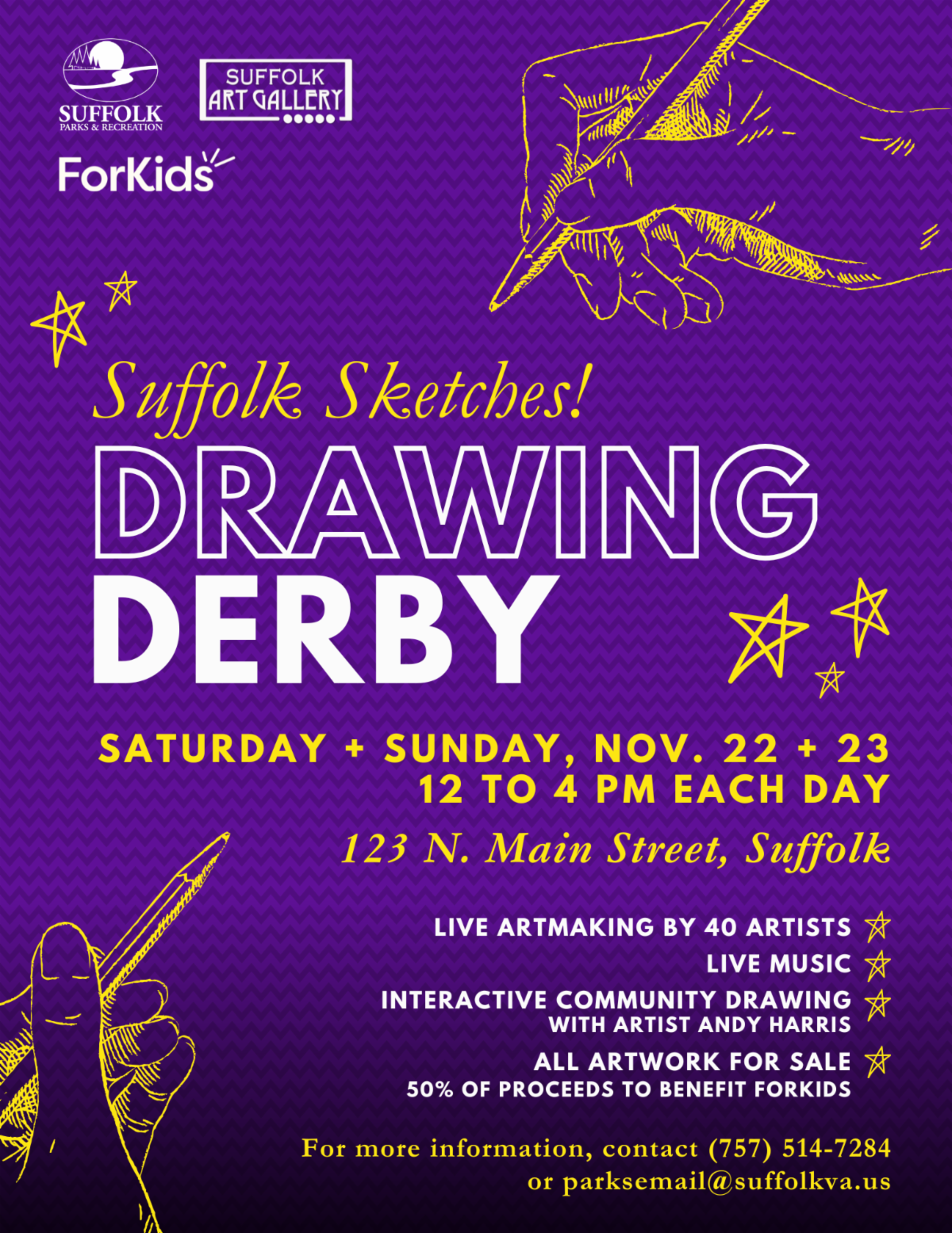 Suffolk Parks & Recreation, Suffolk Art League and ForKids are proud to present Downtown Suffolk's first Drawing Derby on November 22nd and 23rd, 2025 at 12 pm-4 pm each day at 123 N. Main Street (former Suntrust building).