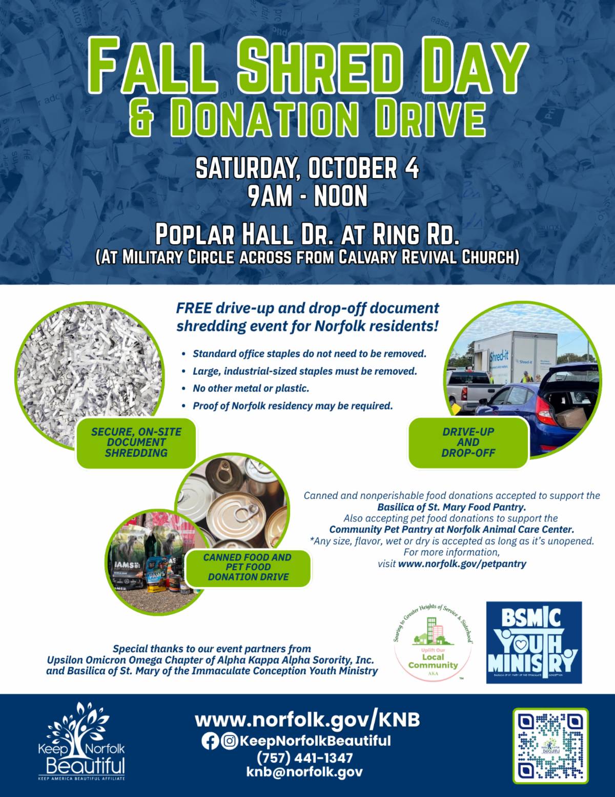 Residents with personal documents that need secure disposal are invited to Keep Norfolk Beautiful’s Fall Shred Day and Donation Drive. This event is hosted in partnership with the Upsilon Omicron Omega Chapter of the Alpha Kappa Alpha Sorority Inc., and the Basilica of St. Mary of the Immaculate Conception Youth Ministry.