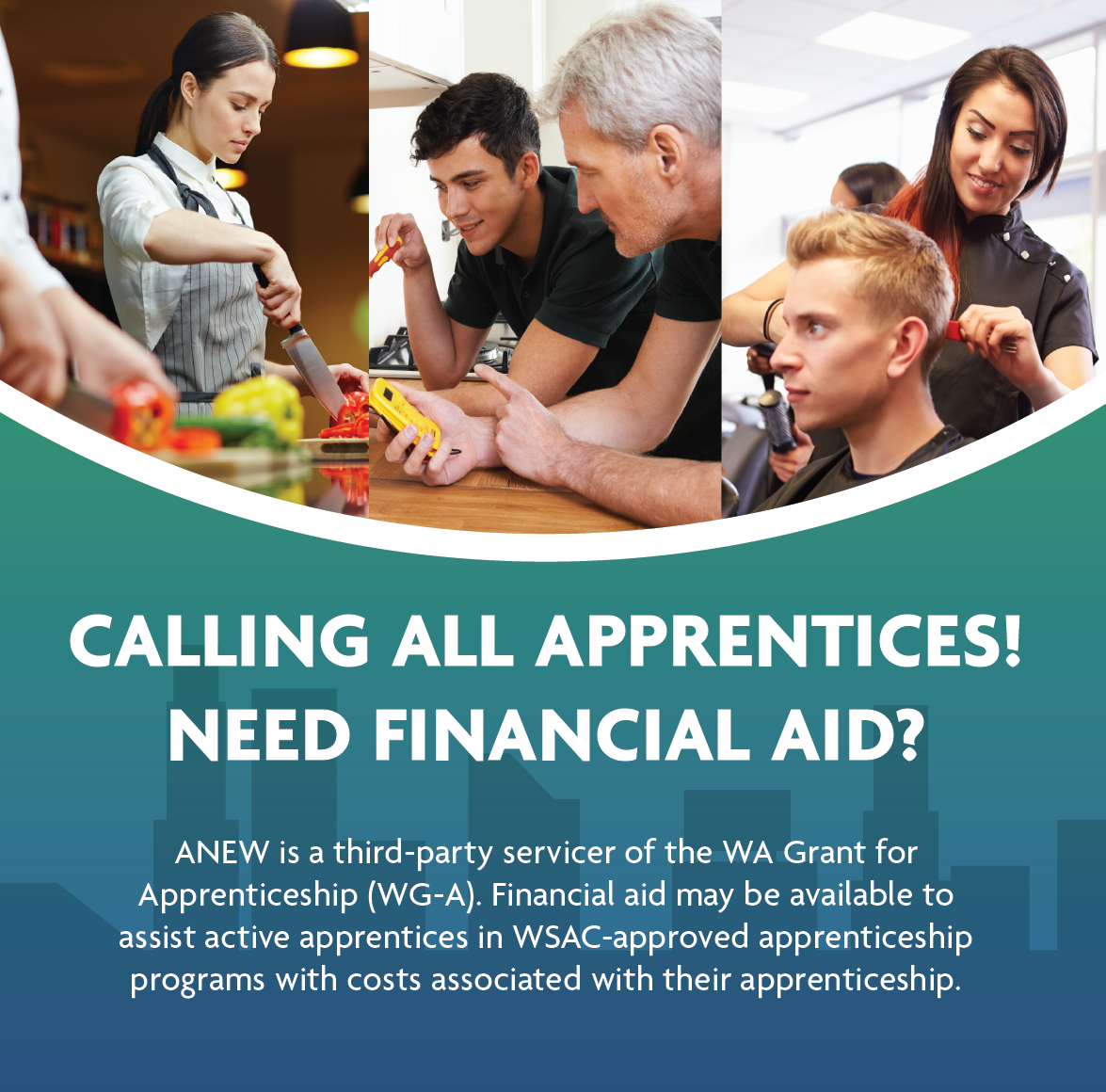 ANEW is a Financial Aid Office for the WA Grant for Apprenticeship (WG-A). This grant is open to all registered apprenticeships in the state of Washington who are approved by the Washington State Apprenticeship and Training Council (WSATC).