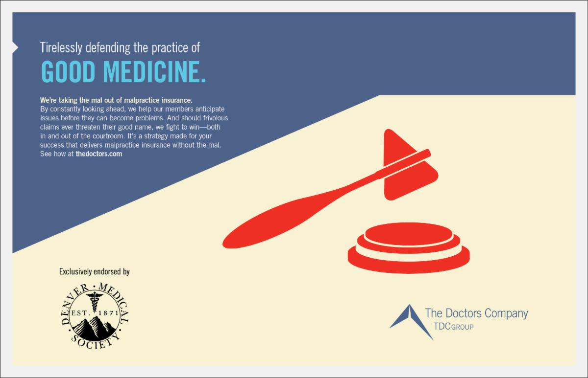 Denver Medical Bulletin: Alan E. Kimura, MD, MPH, Chair /Michael L. Moore, MD, President /Carol A. Stamm, MD, Treasurer/ Stefanie Carroll, MNM, Executive Director. The Bulletin is the official publication of the Denver Medical Society, established April 11, 1871, as the first medical society in the Rocky Mountain West. Published articles represent the opinions of the authors and do not necessarily represent the official policy of the Denver Medical Society. All correspondence concerning editorial content, news items, advertising, and subscriptions should be sent to: The Editor, Denver Medical Bulletin, 1850 N Williams Street, Denver, CO 80218. Phone: (303) 377-1850.