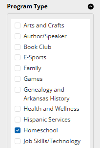Our online calendar features a Homeschool filter that will show Homeschool Connection (HC) programs based in Russellville as well as branch offerings specifically designed for the Homeschool Community. (Change to List, Month, Week, or Day view; you can even print your customized view.)