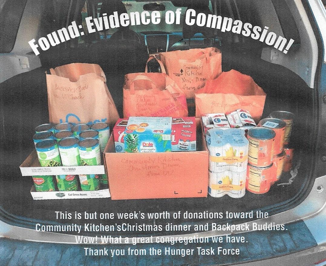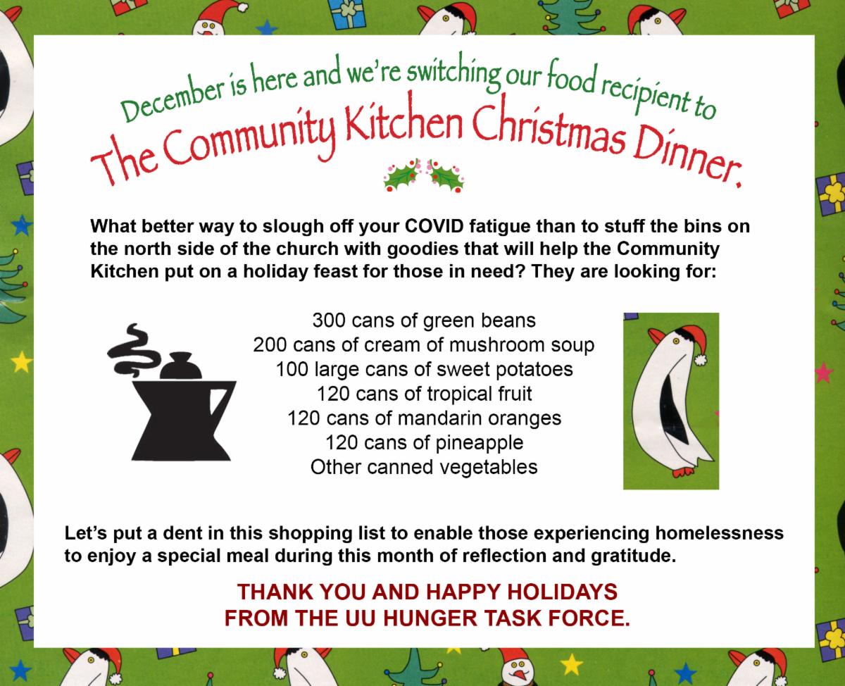 Needed items: Chunky soups, tuna, canned vegetables and fruit, cereal, coffee, peanut butter, macaroni & cheese, powdered milk, pasta, institutional size cans of food, condiments, tea, new socks. Collection bins at the northside Portico Entrance. Simply drive up and drop off--we are collecting donations from these bins daily. Many thanks! --Homelessness Task Force and Hunger Task Force