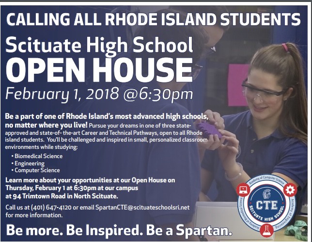 All Scituate 8th Graders and their families are encouraged to attend an evening of getting to know Scituate High School. Families will attend a presentation by Principal Hassell in the auditorium from 6:30-7:30 PM.