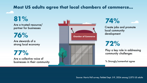 Chambers are Trusted: 81% of U.S. adults agree that their local chamber is a trusted resource and partner for businesses. 90% feel that their local chambers has an impact on growing the local economy.