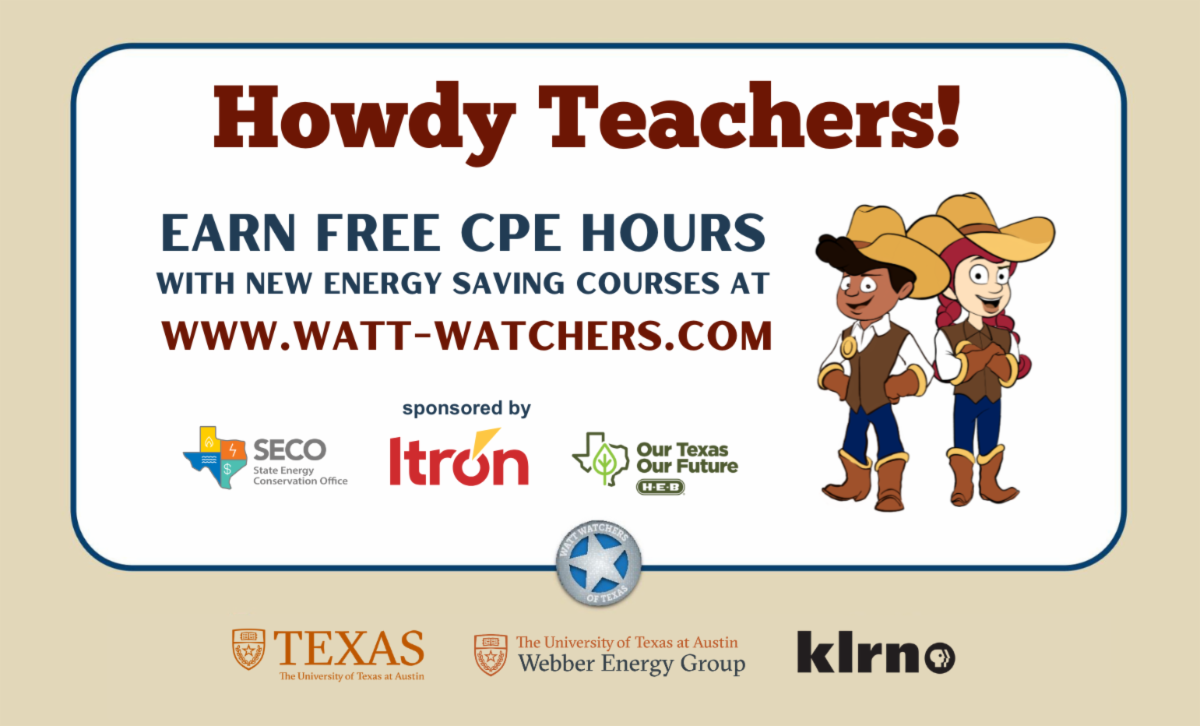 Teachers can access free, online professional development courses from The Watt Watchers of Texas. Each self-paced, one-hour course earns you 1 hour of TEA-recognized CPE credit with an official UT Austin certificate. Gain fresh strategies to engage students in real-world problem-solving, while districts benefit from staff trained in proven energy and water saving practices that reduce waste and support sustainability. Learn more.