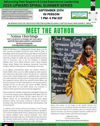 Queen Nzima Hutchings, a literary art wellness master, teaching artist, and advocate, participated in an in-person event on September 25th hosted by the Yale Program for Recovery and Community Health. Nzima joined a panel discussion where she shared insights from her book and spoke passionately about her work as a peer in recovery and behavioral health. Through her literary and advocacy efforts, Nzima helps others find healing and empowerment, using her own journey as inspiration to guide and uplift her community.