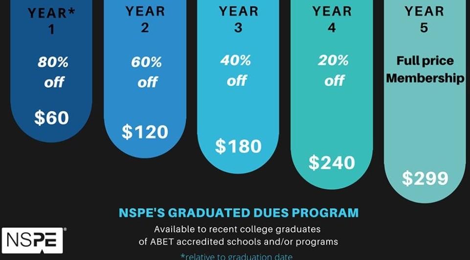 DID YOU KNOW that NSPE offers discounted membership dues to recent college graduates of ABET-accredited schools and/or programs? Qualified recent grads can join NSPE at a discounted rate up to 80% off of full dues, depending upon year of graduation. Recent graduates pay: 20% of full dues the year they graduate; 40% of full dues year two after graduation; 60% of full dues year three after graduation; 80% of full dues year four after graduation; and 100% of dues year five after graduation. Learn more