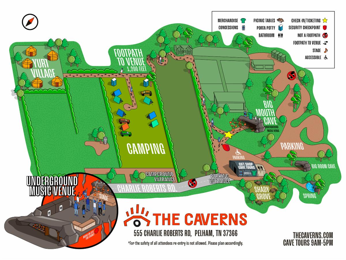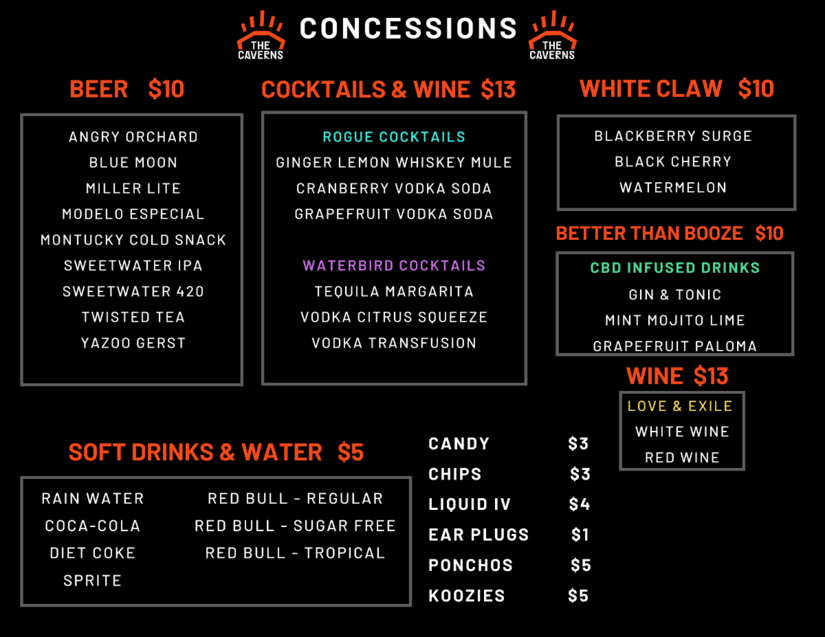 We have a lot of cool items to choose from, like t-shirts, sweatshirts, magnets, stickers, koozies, hats and more. This limited edition screen-printed poster will be available in the cave next to the artist merchandise, and venue merchandise! Merch can be purchased, inside the cave or from 9-5 in the cave tour gift shop. Limited event merch will be available in The Caverns during the show. |