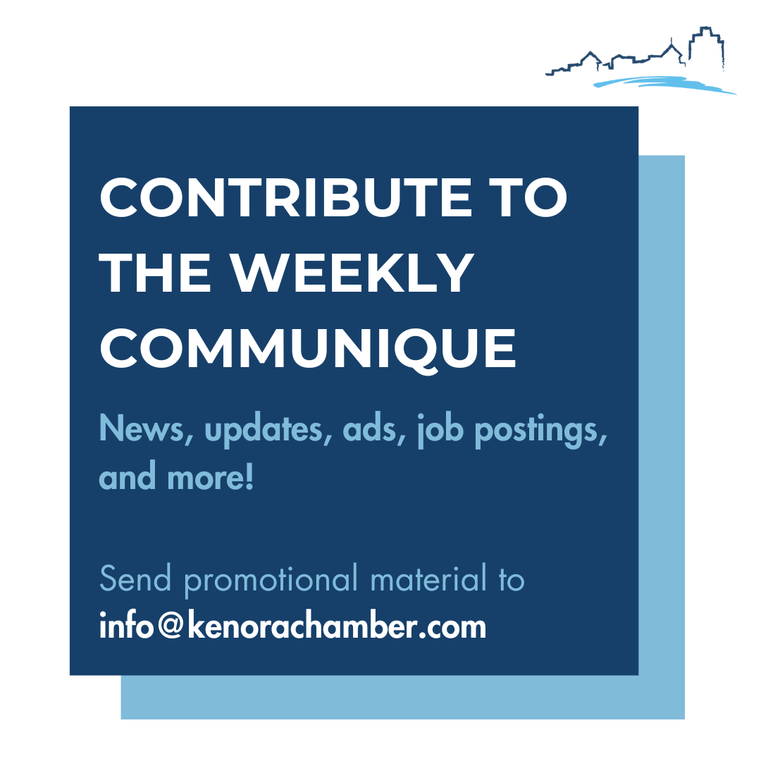 Send your message to info@kenorachamber.com. PLEASE NOTE: the deadline to submit your message to ensure it is included in the upcoming week's communique is Wednesday by 4:00 pm. Your message may also be posted on our Facebook page and/or Instagram.
