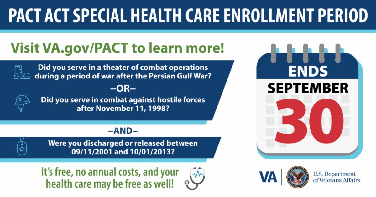 Post-9/11 combat veterans who served between 2001 and 2013 have until Sept. 30 to enroll in Department of Veterans Affairs health care. The date will conclude a one-year "special enrollment period" provided by the PACT Act.