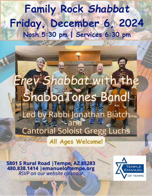 6:30 pm | Erev Family Rock Shabbat with Rabbi Jonathan, Cantorial Soloist Gregg, and the ShabbaTones Band - RSVP here