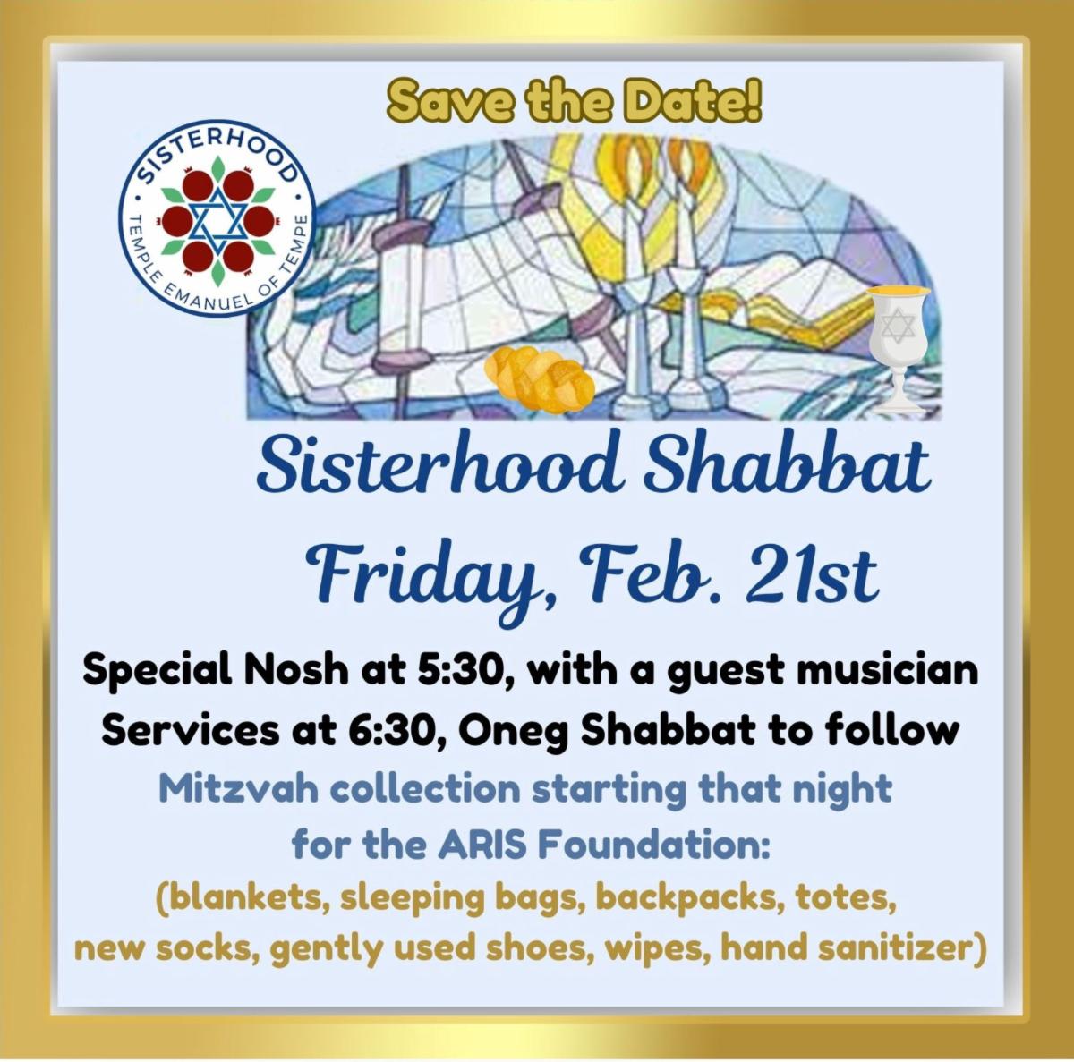 Sisterhood invites all members to join us for a lovely service with Rabbi Jonathan, members of our Sisterhood, Cantorial Soloist, Gregg, and a guest musician sharing the bimah! Please consider bringing items such as blankets, sleeping bags, backpacks, tents, new socks, new or gently used shoes, wipes, hand sanitizer, etc for the Mitzvah collection on behalf of the ARIS Foundation.