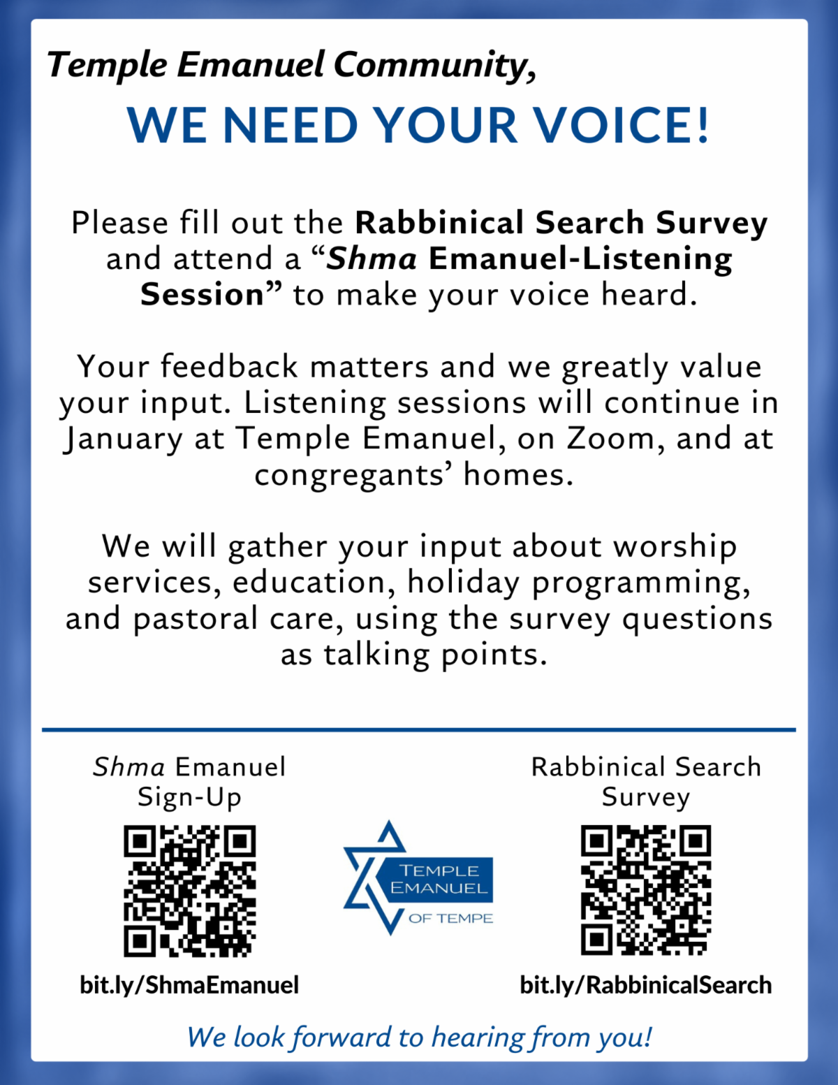 As we reflect on the year so far at Religious School, we are eager to hear about our families' experiences and gather your valuable feedback. We invite all members of our Religious School to please take a moment to complete this survey to help us continue to build a more connected and flourishing Jewish learning community. The survey will be open until Shabbat on January 24th.