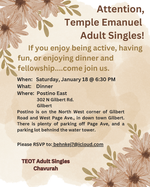 6:30 pm - | Adult Singles Chavurah. More info here