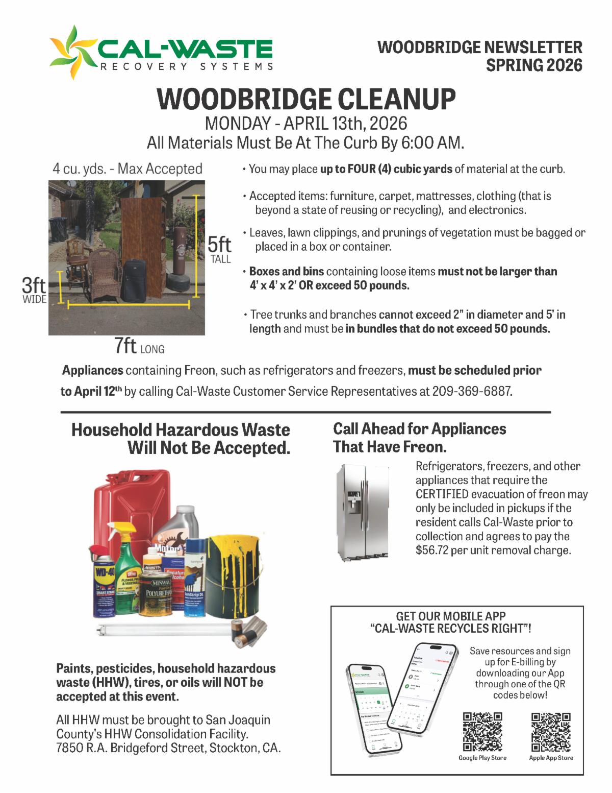 Woodbridge residents are invited to participate in this year’s Community Cleanup on Monday, April 13th, 2026. This special collection event provides an opportunity to dispose of bulky household items that do not fit inside your regular carts.
