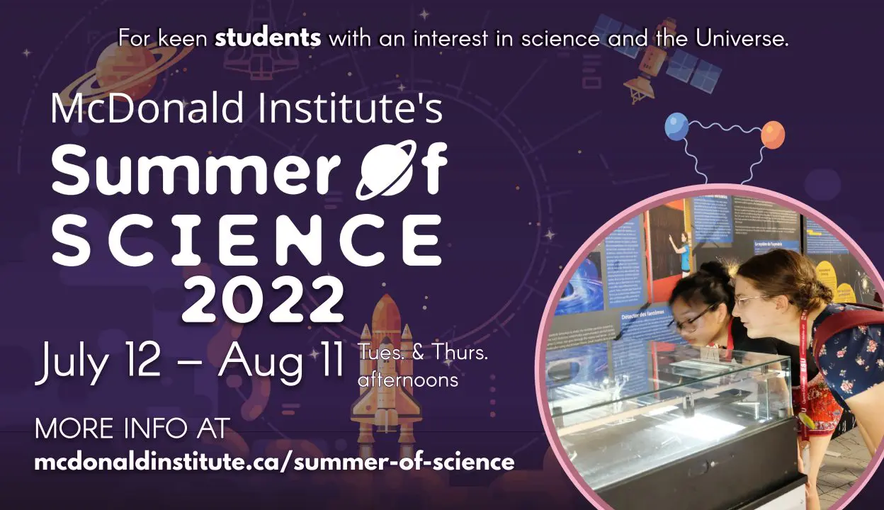 While recognizing the difficulty at this current time, the McDonald Institute will again be running its Summer of Science during summer 2022. The Summer of Science is a free afternoon enrichment program for a small group of high school and middle school students (including students graduating this June). The program will be available virtually, and we will also try to have an in-person cohort for those in the Kingston area. Over 10 afternoon sessions, this program focuses on physics and the process of doing science. The Summer of Science program is led by undergraduates and joined by scientists at the McDonald Institute. Participating students explore through hands-on activities a variety of content and practices that are part of the every-day job of the astronomers and particle physicists at the McDonald Institute. This program’s goal is to supplement the focus on scientific content in the classroom with the tools of the trade that are at the heart of actually doing science. Activities will as much as possible involve students recreating and exploring these demonstrations at home before sharing with their cohort.