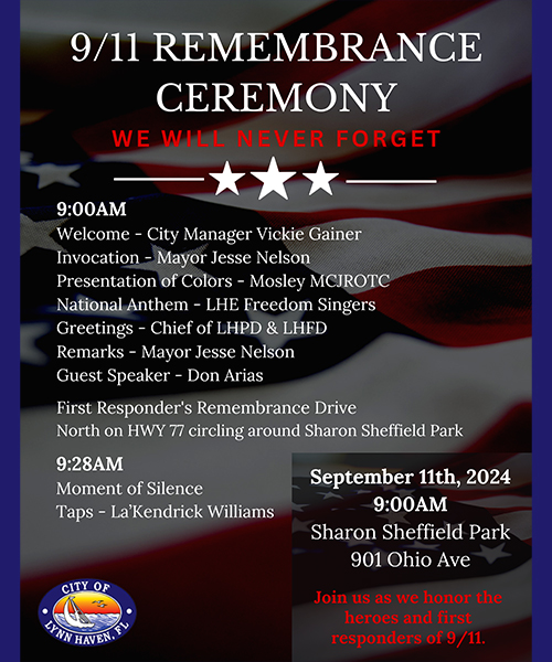 Lynn Haven's annual 9/11 Remembrance Ceremony will be held on Wednesday, September 11th, beginning at 9:00 a.m. at Sharon Sheffield Park, located at 901 Ohio Avenue, Lynn Haven, FL. The ceremony will include remarks from city officials and guest speakers followed by a First