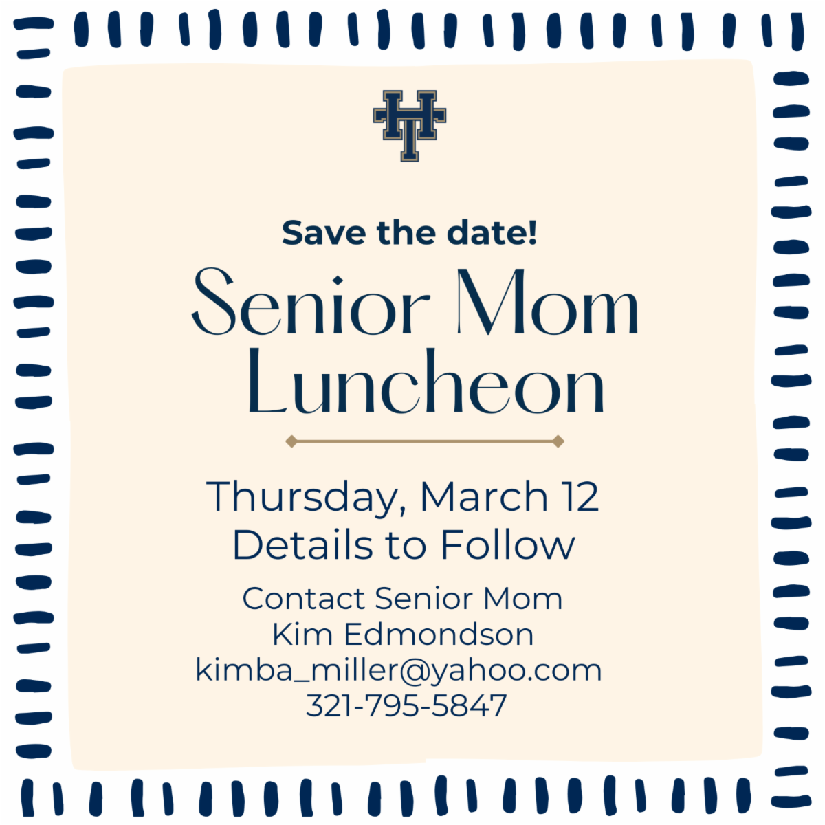| | Class of 2026 students and parents - SAVE THE DATE for Senior Day, Wednesday, April 1, 2026. Come out and celebrate your seniors as they “walk” for the first time, share some of their more memorable experiences at HT, receive the blessing for their caps and gowns, and receive accolades/awards. There will also be an information session for parents on life after “seniordom” with a college freshman. More details to come with exact afternoon start and end times. | | |