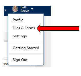 After logging in to OnCampus, Forms can be accessed through the banner at the top of OnCampus or by clicking on your name & selecting Files & Forms.