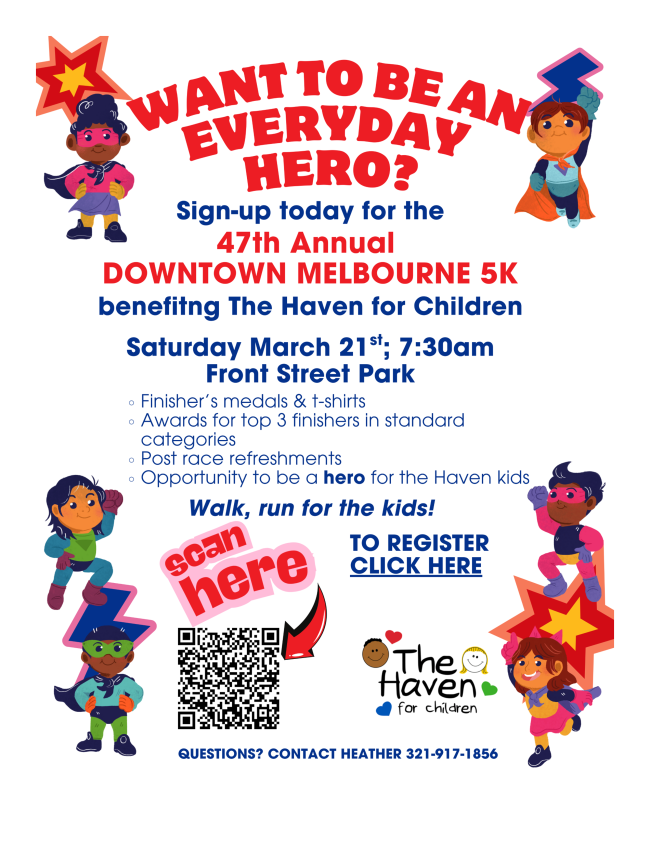 The Downtown Melbourne 5K has their 45th annual run on March 21st. Proceeds will be donated to The Haven For Children. HT students interested in volunteering or participating can sign up at: https://runsignup.com/Race/FL/Melbourne/DowntownMelbourne5K. See flyer under "Community Resources" below.