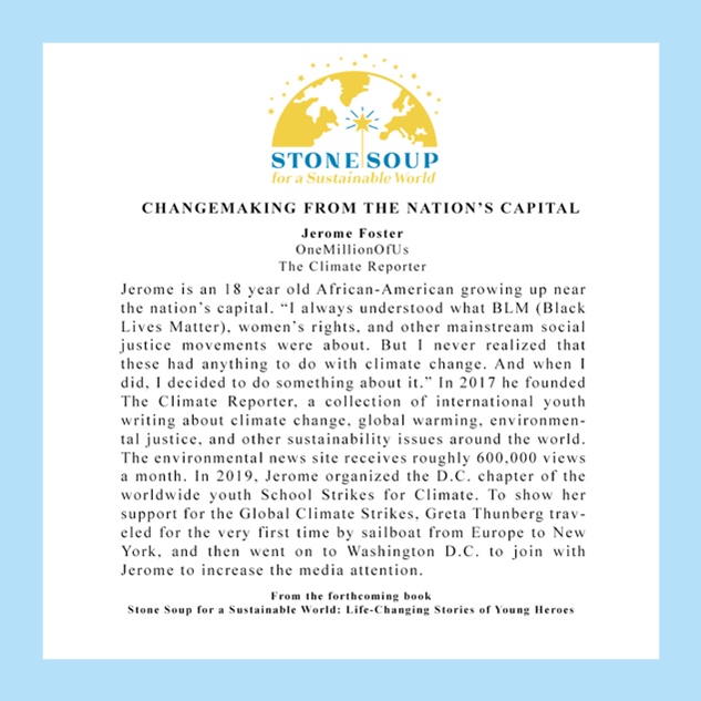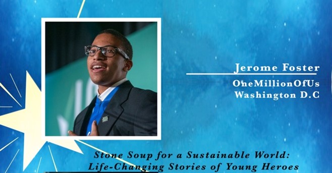 This week, read a short synopsis about Jerome Foster II, executive director of OneMillionOfUs, featured in the upcoming “Stone Soup for A Sustainable World: Life-Changing Stories of Young Heroes.”