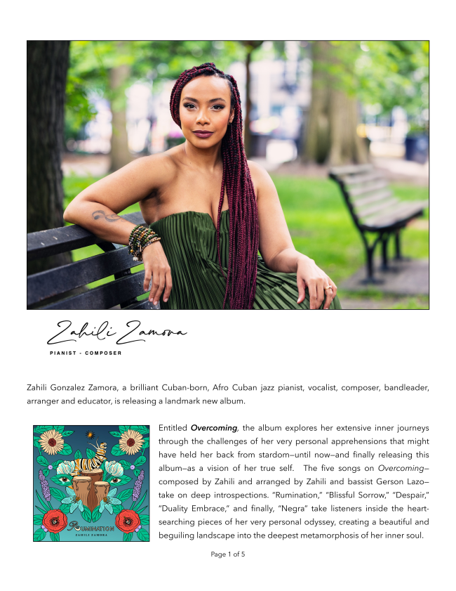 Zahili González Zamora is a brilliant Cuban-born Afro Cuban jazz pianist, vocalist, composer, bandleader, arranger and educator. She is releasing a landmark new album, Overcoming.
