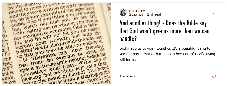| | | Zion has a new blog! Ever wondered what was left out of Sunday's sermon? Each week on Zion's blog And another thing! Pastor Emily will add some extra context to the texts for the week that didn't make the sermon. As time goes on, we will expand the blog to include guest writers. Click the image to check out the first post and remember to subscribe to get updates when new posts are released. | | | |