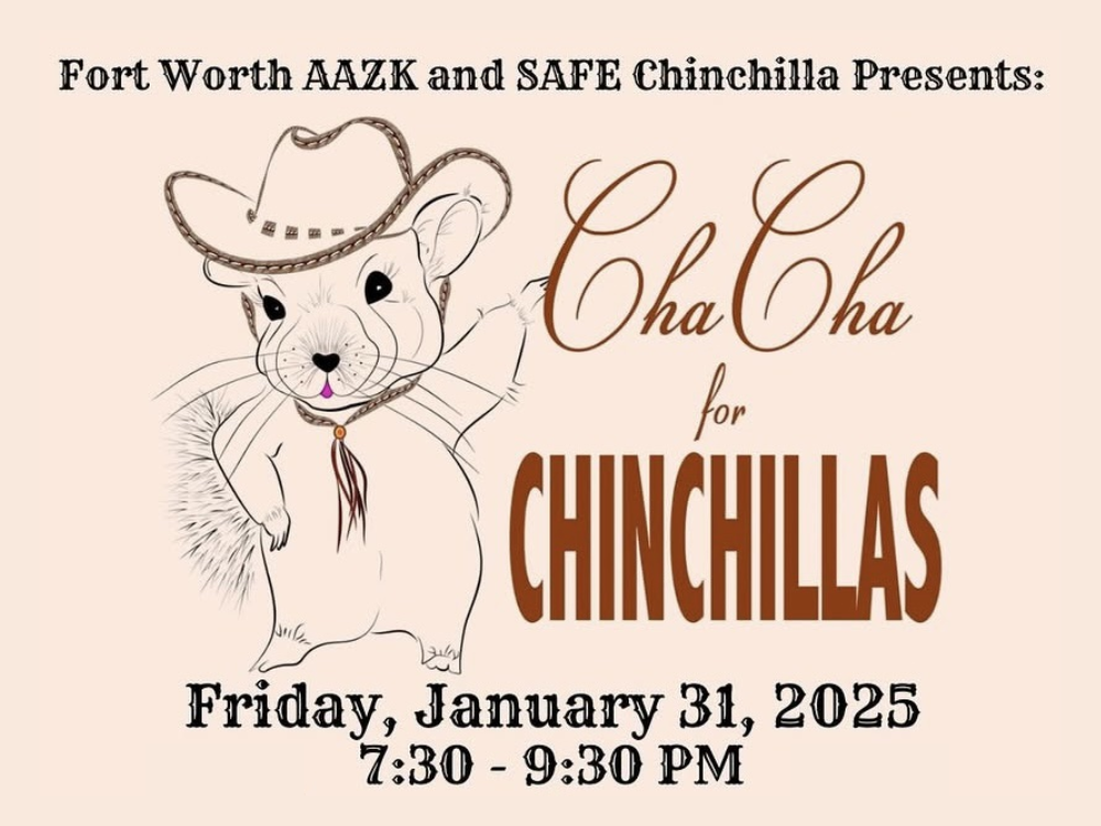 Fort Worth AAZK's new fundraiser will take place on Friday, Jan. 31 from 7:30 to 9:30 p.m. and feature a dance class, raffle, socializing, and more! The profits of this event will go toward SAFE Chinchilla to support their efforts in helping this species.