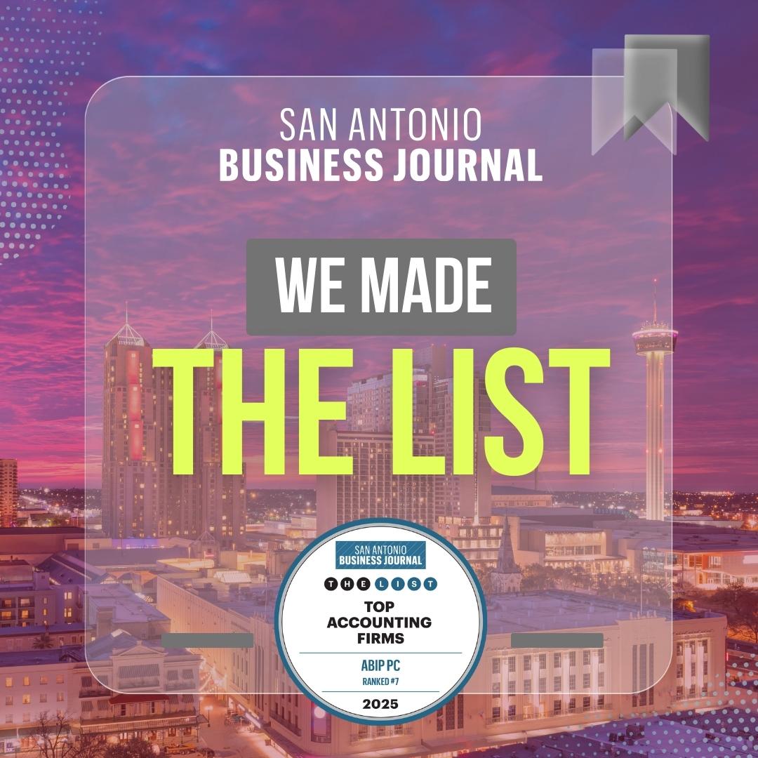 The abip San Antonio office is proud to announce that we’ve been recognized on the San Antonio Business Journal’s Top Accounting Firms list. This recognition highlights the dedication of our talented CPAs and professionals and our continued commitment to delivering trusted audit and assurance services to our clients and community.