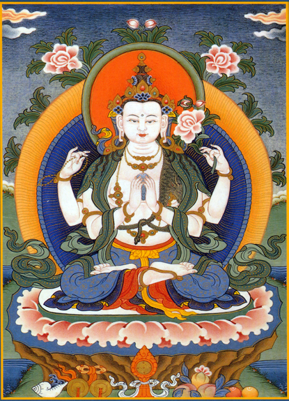 ) means “he who looks over the world.” He looks over the world and hears the groans of all who suffer. In this way, Chenrezi is the embodiment of awakened compassion.