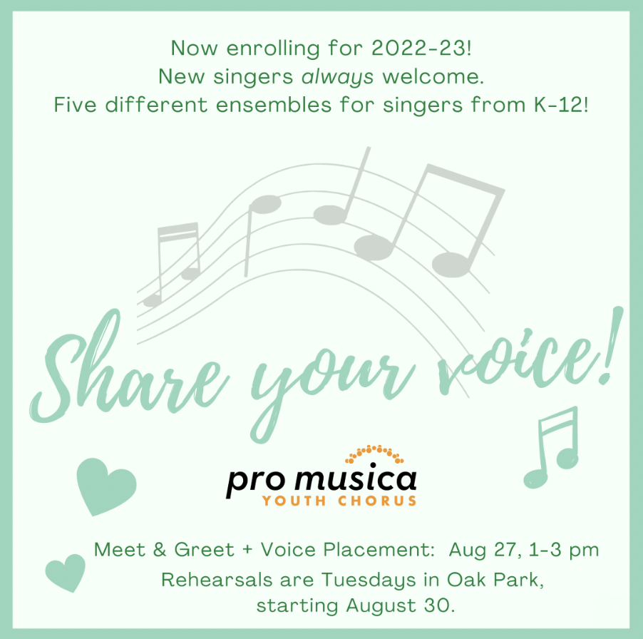 Heritage Chorale is recruiting singers to join its 50-member chorus based in Oak Park, IL. Rehearsals are Monday evenings.