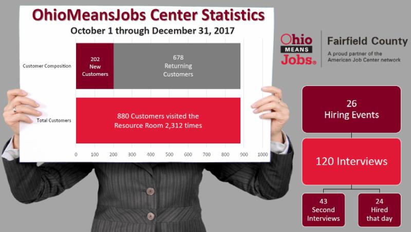 The Ohio Means Jobs (OMJ) Center in Fairfield County works not only with job seekers, but also businesses. There are a variety of services available to employers who are hiring including posting and promoting job openings, collecting applications/resumés, pre-screening applicants, Job Fairs, job seeker referrals and hosting hiring events. Hosting hiring events has become increasingly popular over the last year. In the last quarter of 2017 alone, JFS and the OMJ Center hosted 26 separate hiring events where a total of 120 job seekers were interviewed.