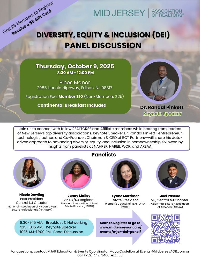 Join us to hear from NJ's leading diversity associations, and updates from 2025 MJAR President and our dedicated MJAR Committee. Connect and network with fellow REALTORS® and Affiliate members to foster valuable relationships. Download the flyer here. Speakers include: