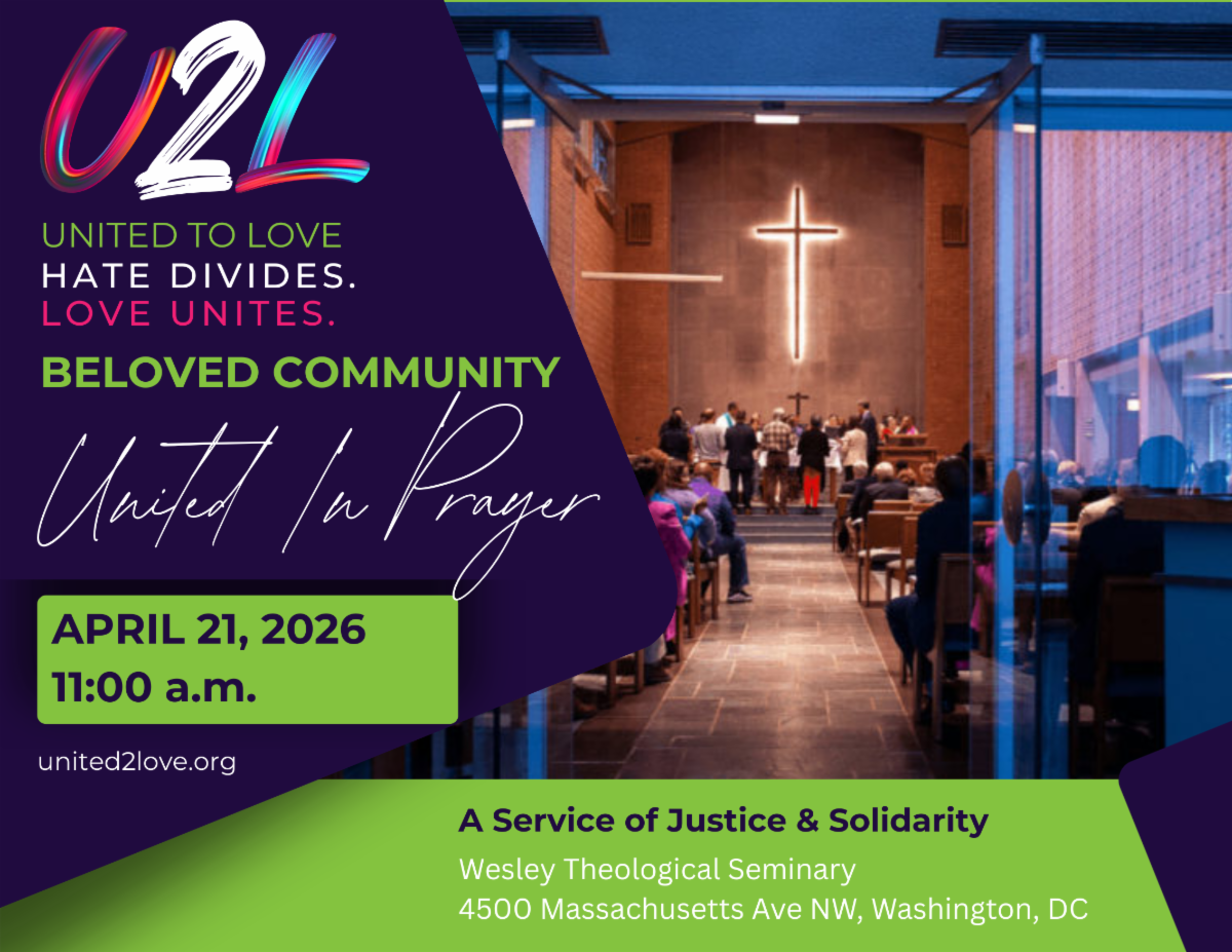 You are invited to step away from the noise and into a sacred space of prayer, reflection, and connection at the Beloved Community, United in Prayer event on April 21 at Wesley Theological Seminary. In a time marked by division, we gather to center ourselves in God’s love that restores, reconciles, and unites. Together, we will listen deeply, pray boldly, and open our hearts to the Spirit’s movement within and among us. Hate divides. Love unites. Learn more and register.