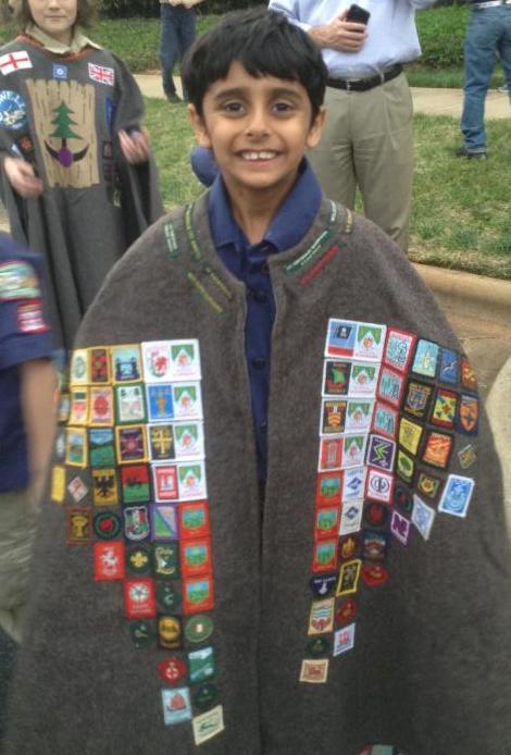 The other activity I did with all the Cubs last night was a quick talk on the tradition of European style campfire blankets. If you want to get elementary school age kids excited about Scout patches the thought was let them put on some neat patch blankets and get their picture made. This snapshot is of one of our Tigers whose dad grew up as a Scout in India. So I think he can appreciate this tradition and maybe relate to all those district badges. I had to talk fast because being outside in the spring made these cubs restless.