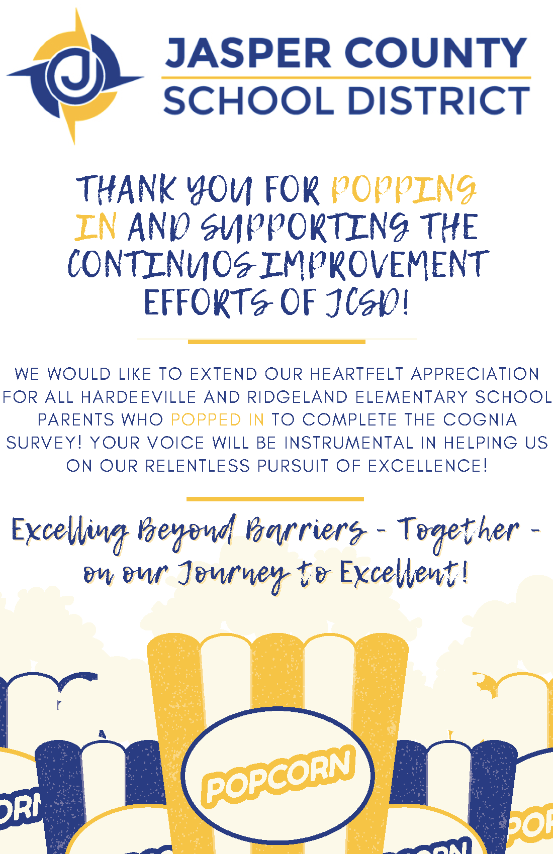 Great Work, Jasper County! Special thanks to our scholars and their teachers. They did an outstanding job during the emergency school closing caused by Hurricane Idalia. With very little notice, they pivoted very quickly to eLearning. Amid the storm, our scholars were logged in and learning. Our staff displayed professionalism as well as an unwavering commitment to providing teaching and learning. Dr. Martin Luther King says, "The ultimate measure of a man is not where he stands in moments of comfort and convenience, but where he stands at times of challenge and controversy." Jasper County, you should be proud of how you responded to this challenge. Let's continue to work together to keep Jasper County School District Student-Centered...Future-Focused! |
