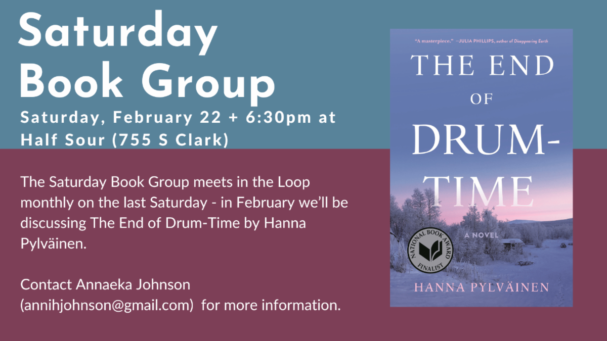 The Saturday Book Group meets in the Loop monthly on the last Saturday - in February we’ll be meeting at Half Sour (755 S Clark), we'll be discussing The End of Drum-Time by Hanna Pylväinen.