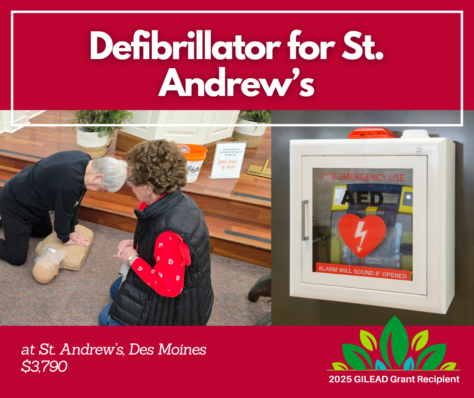 We've completed our first aid safety plan for our church by purchasing and mounting portable AED (Automated External Defibrillator) in a high-traffic area of the church. With a significant number of elderly members and our location in a lower income neighborhood with a community refrigerator and community garden on-site, we want to be prepared and equipped to respond to First Aid needs if they arise. Grant funds have been used to purchase the portable AED and wall cabinet to house it, and funds covered Red Cross volunteer training for First Aid (which includes AED training) fees for at least 10 people across the tri-church community (St. Andrew’s, Trinity Cush, & the Darfur Community of Iowa all share space in the building, and all 3 expressed interest in having several of their members trained).