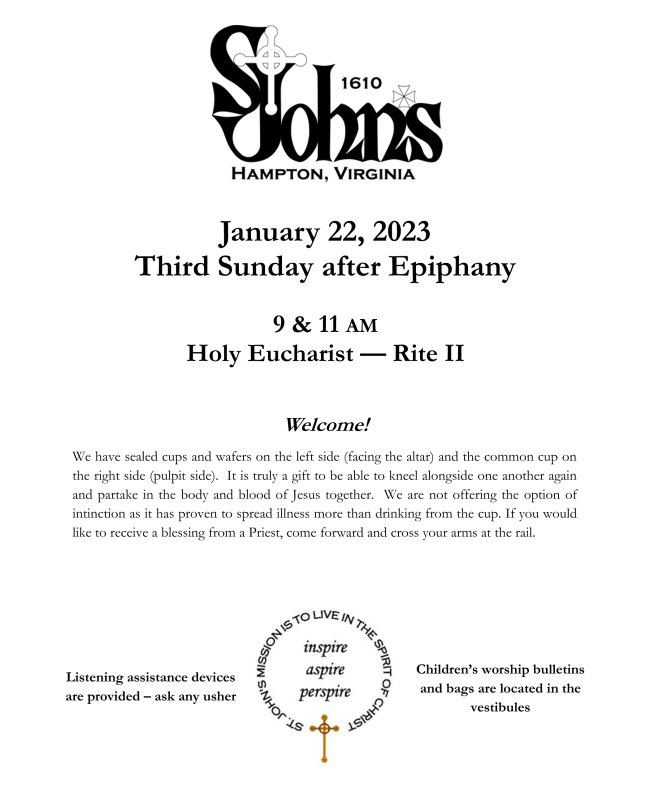 | Annual Meeting: On Sunday, January 29th, we will have one worship service at 10am. Following the service, please join us in the church for St. John’s Annual Meeting including the election of new vestry members and then in the parish hall for breakfast. There will be no Christian formation, but Nursery will be provided. | Altar Flowers: We need people to sign up for altar flowers! If you would like to honor or memorialize a loved one, event, or occasion, please sign up for a Sunday of altar flowers. Contact Anne Chisman Abraham by email or at 757-714-8215. | Charitable Trust: Over the past years, the St. John’s Charitable Trust has made numerous grants to many charitable organizations and we have received Thank You notes, letters and acknowledgements from many of these recipients. These are posted on the Parish House bulletin board located in the hall near Mark’s office to share with the parish, so please take a look at your next opportunity. | EM{BRACE}: If you are cleaning out your closets or attics or helping a friend or family member downsize, keep EM{BRACE} in mind. A collection bin will be available in the parish hall to collect Durable Medical Equipment (DME) for those in need in under-developed countries. DME is items such as canes, crutches, braces, splints, walkers, wheelchairs, commodes, etc. | Stewardship: For those who have requested them, pledge envelopes will be available in the parish house on January 1st. If you haven’t pledged yet, it’s not too late! Call the office to request a pledge card today. | Altar Guild Volunteers Needed: The altar guild is a critical ministry of the church. They set up our altar and enable us to have our Sunday worship. All you need to do is arrive approximately 30 minutes before the service to help set up. No Saturdays are required! If you cannot commit to a Sunday, but would still like to help make our altar lovely on Sunday, please consider our linen ministry. All you need is a washing machine and an iron. You would take home our purificators (what we use to wipe the cup), wash, iron and return to the church. If you are interested, please contact Lynn Kirkland. | Chanco Staffing: If you, or someone you know, loves the outdoors, Jesus, and working with kids Camp Chanco would encourage you to apply for one of the many positions they need to fill for the coming summer. Positions include Activities Director, Kitchen Staff, Counselors, Ropes Instructor, Lifeguards, Nature Instructors, Photographer, Sailing Instructors, Nurse, Chaplin, Operations Director, Aquatics Director. All positions include housing, meals and training. This is a fantastic opportunity to build your resume, make new friends and help make memories for kids that will last a lifetime. For more information please email programs@chanco.org, or to apply go to campchanco.campbrainstaff.com. | Kroger Community Rewards Program: For the past several years, St. John’s has partnered with Kroger and benefits from their Community Rewards program. Every person who links their Kroger card to St. John’s under the community reward program helps St. John’s receive a quarterly bonus payment. Currently, we only have 15 families linked and our devoted treasurer faithfully updates the Vestry on the quarterly amount received. Please consider linking your card to us, so we can grow this free benefit! Read more here! Our organization number is AD255. | |
