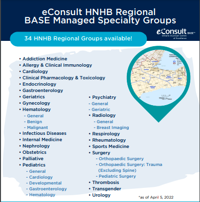 The benefits of sending your eConsult to these groups include specialist awareness of local services and supports, and increasing collaboration and knowledge transfer between providers practicing in the same region. The HNHB deployment team at the HITS eHealth Office manages the HNHB regional specialty group to ensure health care providers receive a timely response.