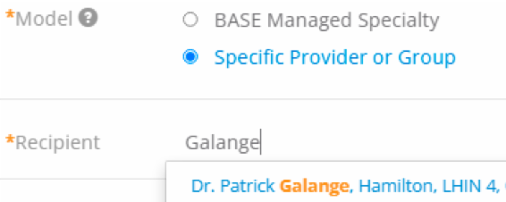 To send Dr. Galange an eConsult, select Specific Provider or Group, and search for his name in the Recipient field, as shown here: | | |
